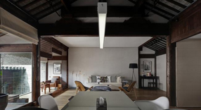 創(chuàng)作者只表達光和空間,封閉原始建筑除東南方向以外的所有光源,讓光線在朝夕之間的自然變化中,通過交疊屋面,序列構架等物理構筑物將虛體光線實體化,而光影隨著時間的變化產生不同的角度,空間變得讓人感動,由“光”將空間呈現(xiàn),并埋伏“暗”增強空間厚度。仿佛孿生雙子,“光”與“暗”彼此勉勵、彼此愛慕,又彼此憎惡,彼此傷害。歷經暗的擠壓,光迸發(fā)出更強烈的力量引人深入。