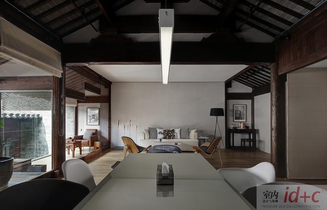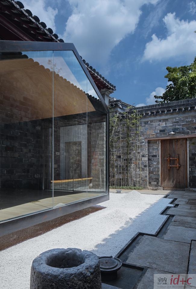北側加建兩棟仿古建筑共組三進式院落,入口古樸,尺度窄小,通過時低頭,抬頭時開朗,院內樹木建筑交織映襯,和諧優(yōu)雅。隨機緣為名谷設計機構進駐??陀^來說,仿古建造的第二進“來院”建筑基底并非優(yōu)越。工藝的精準度、材料的運用不及古人的手工制作,加之缺少時間的沖刷洗練,與真跡并肩多少夾雜一絲尷尬。即便如此,它仍反應了當下這個時間空間內人們對傳統(tǒng)最質樸的追念、渴望。