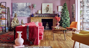 壁爐上方有幾尊佛像,左一為石雕,是公元二三世紀(jì)犍陀羅時(shí)期的佛像,接下來的上方是越南象牙金身阿彌陀佛像,下方是兩尊西藏銅塑佛像。壁爐上方的畫作來自上海藝術(shù)家。右邊有大小兩個(gè)佛像頭部,也是犍陀羅,這是最早的佛像雕塑,深受 當(dāng)年亞歷山大大帝所帶來的希臘雕塑 風(fēng)格影響。下面一個(gè)橫幅的面具木雕 也來自排灣族。壁爐里是一尊明代木 雕金身釋迦摩尼像。右面墻上的畫作是中國臺(tái)灣畫家黃致陽的作品。中央的咖啡桌與右側(cè)兩張扶手椅,出自北歐設(shè)計(jì)品牌Matzform。桌上擺放的是咸豐年間民窯瓷器牛血花瓶。所有 圣誕裝飾來自連卡佛。