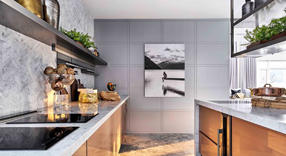 一經(jīng)對(duì)空間結(jié)構(gòu)的精微調(diào)整,中西分區(qū)的開(kāi)放式廚房布局也得以在更完整和寬裕的空間內(nèi)施展,餐廳因此有了更貼近自然的景觀向位。廚房的立面處理選用大面積大理石進(jìn)行幾何式拼貼,賦有柔暖光澤的黃銅櫥柜飾面作為搭配,讓開(kāi)放式餐廚看上去充滿經(jīng)典時(shí)期摩登(Modernism)的設(shè)計(jì)感和時(shí)代特征。
