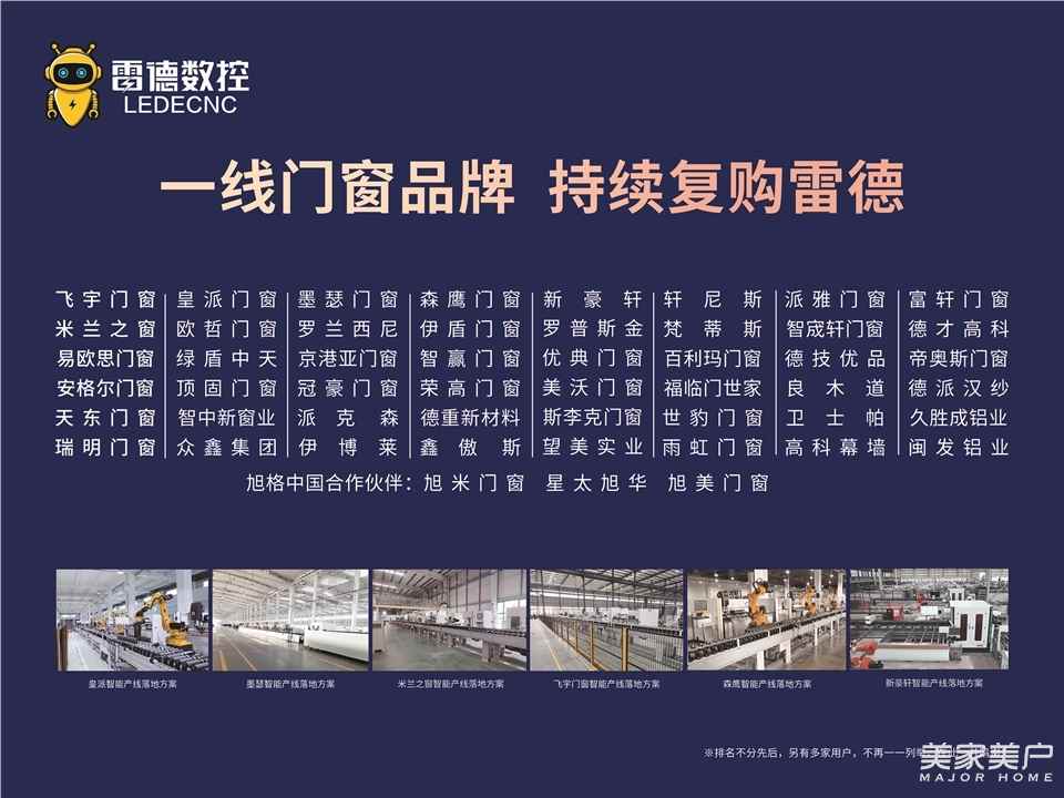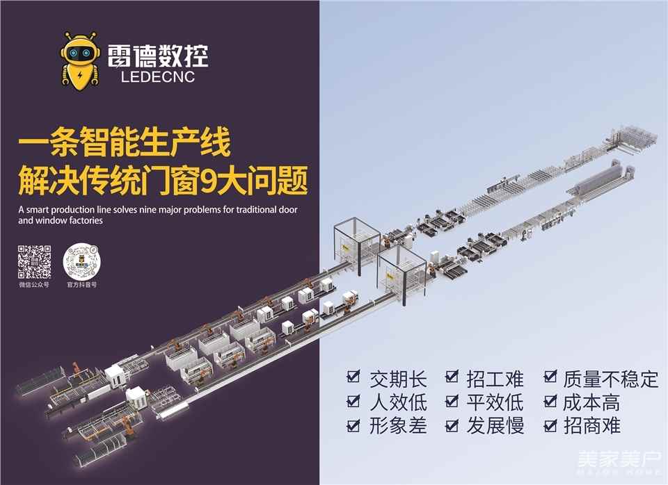 本次展會帶來的新品S系列鋁門窗智能生產(chǎn)線,采用智能鋸銑中心、智能加工中心、智能雙頭端面銑、工業(yè)機器人、智能分揀線、智能組角及整套系統(tǒng)進行協(xié)同作業(yè),型材不落地,實現(xiàn)智能化、數(shù)字化的生產(chǎn)模式,解決傳統(tǒng)工廠交期長、招工難、品質(zhì)不穩(wěn)定等一系列問題,采用雷德數(shù)控S系列智能生產(chǎn)線年產(chǎn)能可達10平米,助力門窗企業(yè)打造成為全方位的工業(yè)4.0生產(chǎn)基地,提高產(chǎn)品競爭力和市場占有率。公司目前已與眾多一線門窗品牌達成合作,如:飛宇門窗、皇派門窗、米蘭之窗、墨瑟門窗、森鷹門窗、軒尼斯門窗、歐哲門窗、羅蘭西尼、新豪軒門窗、富軒門窗等100余家,已多次復購雷德數(shù)控產(chǎn)品。