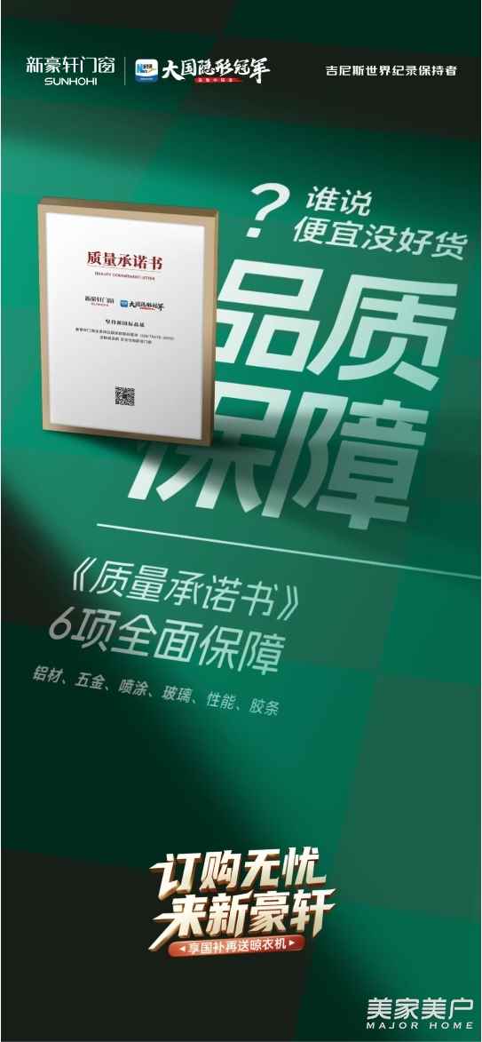 打造好門(mén)窗,筑造理想家,是新豪軒的不變初心。近年來(lái),新豪軒先后推出「平安承保」「質(zhì)量承諾書(shū)」「貨期承諾」等三大保障,從不同維度護(hù)航消費(fèi)者的門(mén)窗消費(fèi)體驗(yàn)。本次訂購(gòu)無(wú)憂(yōu)險(xiǎn)的發(fā)布,既是新豪軒冠軍擔(dān)當(dāng)?shù)木裱永m(xù),更是新豪軒保障體系的質(zhì)變升華。