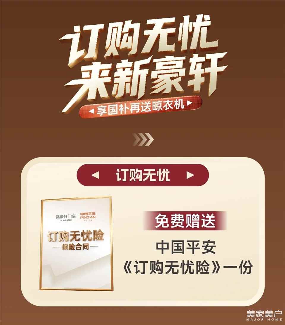 今年盛夏,新豪軒聯(lián)合中國(guó)平安保險(xiǎn),重磅發(fā)布行業(yè)首個(gè)門(mén)窗消費(fèi)險(xiǎn)——「訂購(gòu)無(wú)憂(yōu)險(xiǎn)」。該保險(xiǎn)鎖定門(mén)窗消費(fèi)中貨不對(duì)板、交期延誤、責(zé)任推諉的核心問(wèn)題,提供「品質(zhì)無(wú)憂(yōu)」「交付無(wú)憂(yōu)」「售后無(wú)憂(yōu)」三大保障,違約立即賠付,護(hù)航安心消費(fèi)!