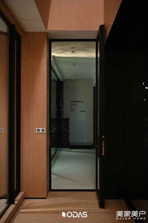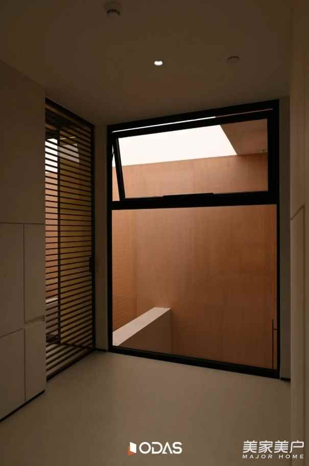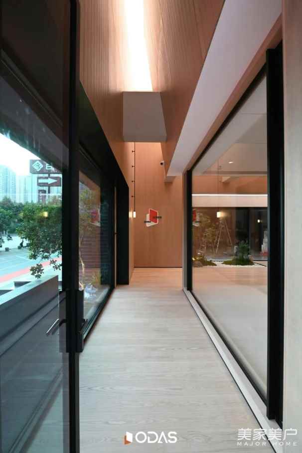 白天,陽(yáng)光透過(guò)玻璃鋪滿通道,光影在原木豎條板上躍動(dòng),打開(kāi)通風(fēng)窗,新鮮空氣自然涌入,既保有“光為空間主調(diào)”的通透,又滿足通風(fēng)之需;傍晚,室內(nèi)燈光暈染而出,通風(fēng)窗與整體設(shè)計(jì)渾然一體,不擾峽谷靜謐。