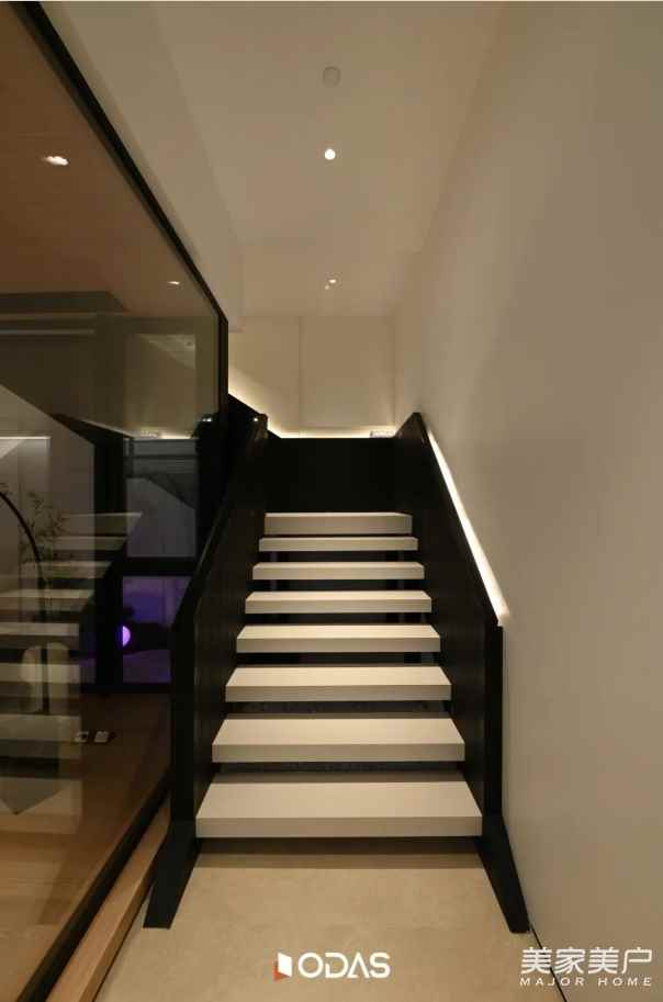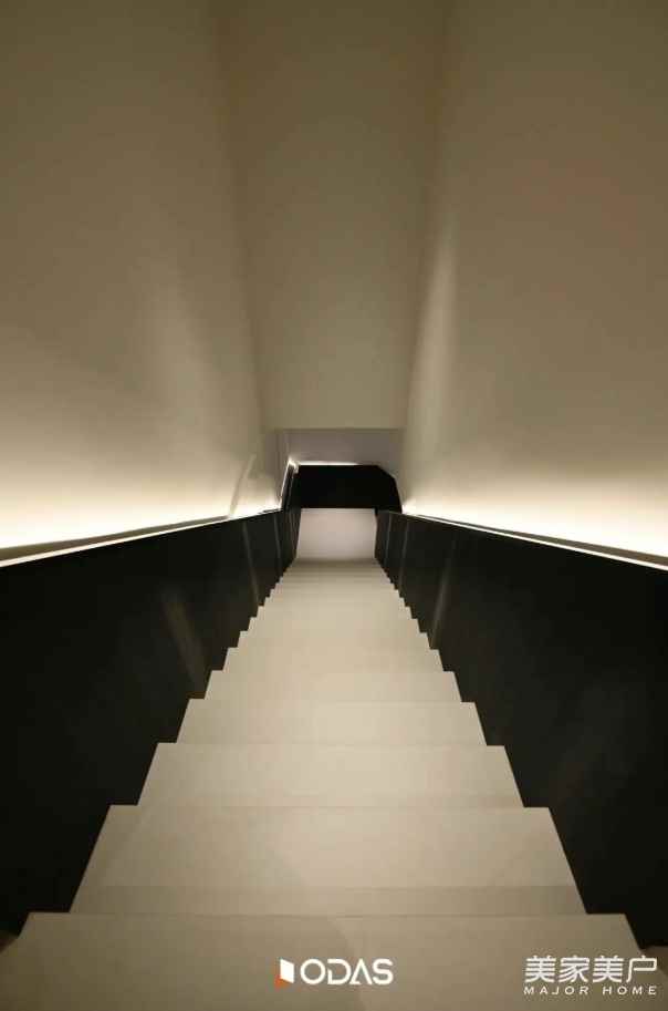 抵達(dá)樓梯盡頭的轉(zhuǎn)角,眼前這條通透的走廊,便是二層 “空中閣樓” 的序章。腳下與身旁的材質(zhì):不再是一層溫潤(rùn)的原木與粗獷的石材,取而代之的是帶有細(xì)膩光澤的金屬線條、清透的玻璃與精密板材。