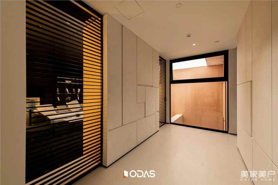 頂部的天光系統(tǒng)會(huì)隨著外界天色變化調(diào)整亮度,兩側(cè)墻面的側(cè)光與點(diǎn)狀射燈則巧妙藏在原木格柵后,光線透過(guò)格柵的縫隙灑下來(lái),再經(jīng)過(guò)身旁門窗的玻璃折射,在地面、墻面形成斑駁流動(dòng)的光影。光不僅把原木的肌理、石材的質(zhì)感雕琢得更有層次,更讓整個(gè)空間“活”了起來(lái)。
