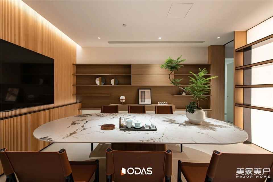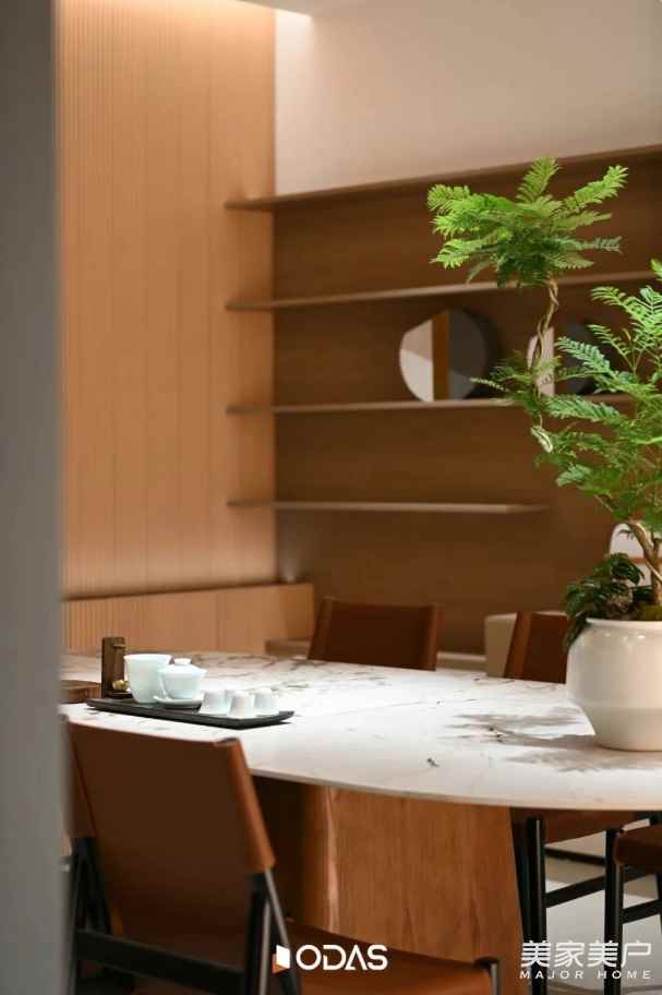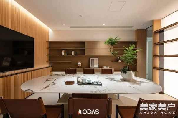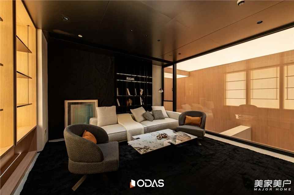 在歐大師泉州健康人居藝術(shù)館的「洽談體驗(yàn)區(qū)」,結(jié)合商務(wù)會(huì)議、VIP洽談、休閑茶室等體驗(yàn)功能。洽談區(qū)是整個(gè)自然峽谷的“核心”,一個(gè)被清透玻璃和原始石材包裹的沉思之所。