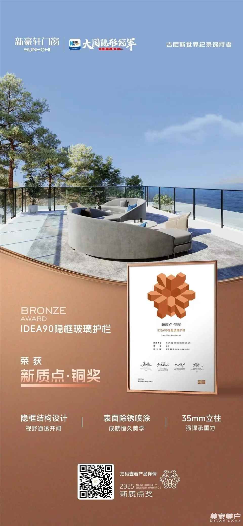近日2025新質(zhì)點設(shè)計獎頒獎典禮于北京清華科技園陽光廳隆重舉行新豪軒門窗憑借創(chuàng)新工藝和具備時代價值的產(chǎn)品設(shè)計脫穎而出,成為業(yè)內(nèi)首家獲獎品牌,其中IDEA90隱框玻璃護(hù)欄榮獲新質(zhì)點·銅獎,IDEA05智能極窄門、Edge50智能陽光房、天際系列執(zhí)手?jǐn)孬@新質(zhì)點獎。這份榮譽不僅見證了新豪軒門窗在設(shè)計領(lǐng)域的卓越實力,更體現(xiàn)了中國家居對產(chǎn)品設(shè)計價值的全新認(rèn)知與追求。