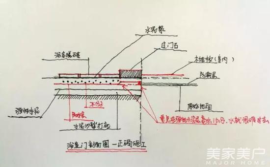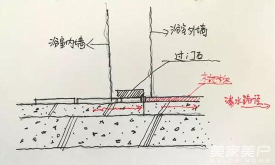 中間紅箭頭的地方,就是忘了做的地方??吹?jīng)],師傅若沒做突起,水分就可以直接從浴室通到臥室地板下溢出來。