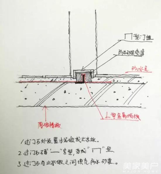 若用“一”字型的過門石,就是像最上面幾張圖畫的那樣,即使防水層有突起,但若門檻底下用了含水的水泥漿,會造成虹吸效應(yīng)(指水若從磁磚底下漏,門檻底下水泥漿有細縫的話,則水分會自動延著細縫,跑到?jīng)]有水分的木地板那一側(cè))。