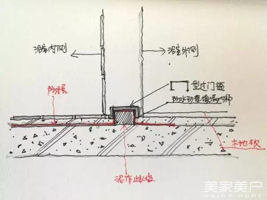 浴室的過門處工藝做不好的,是很常見的疏忽,有的會在墻腳下的踢腳板后發(fā)霉,有的浴室旁的地板變形,今天就給大家普及下,我們該怎么做浴室門口的防水呢?